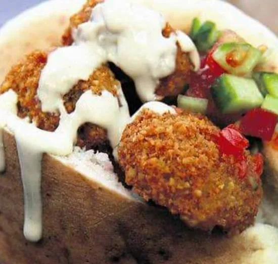 Crisp Falafel, Traditionally Served In A Pita Bread With Hummus, Israeli Salad, Sauerkraut And Toped With Tehina Sauce